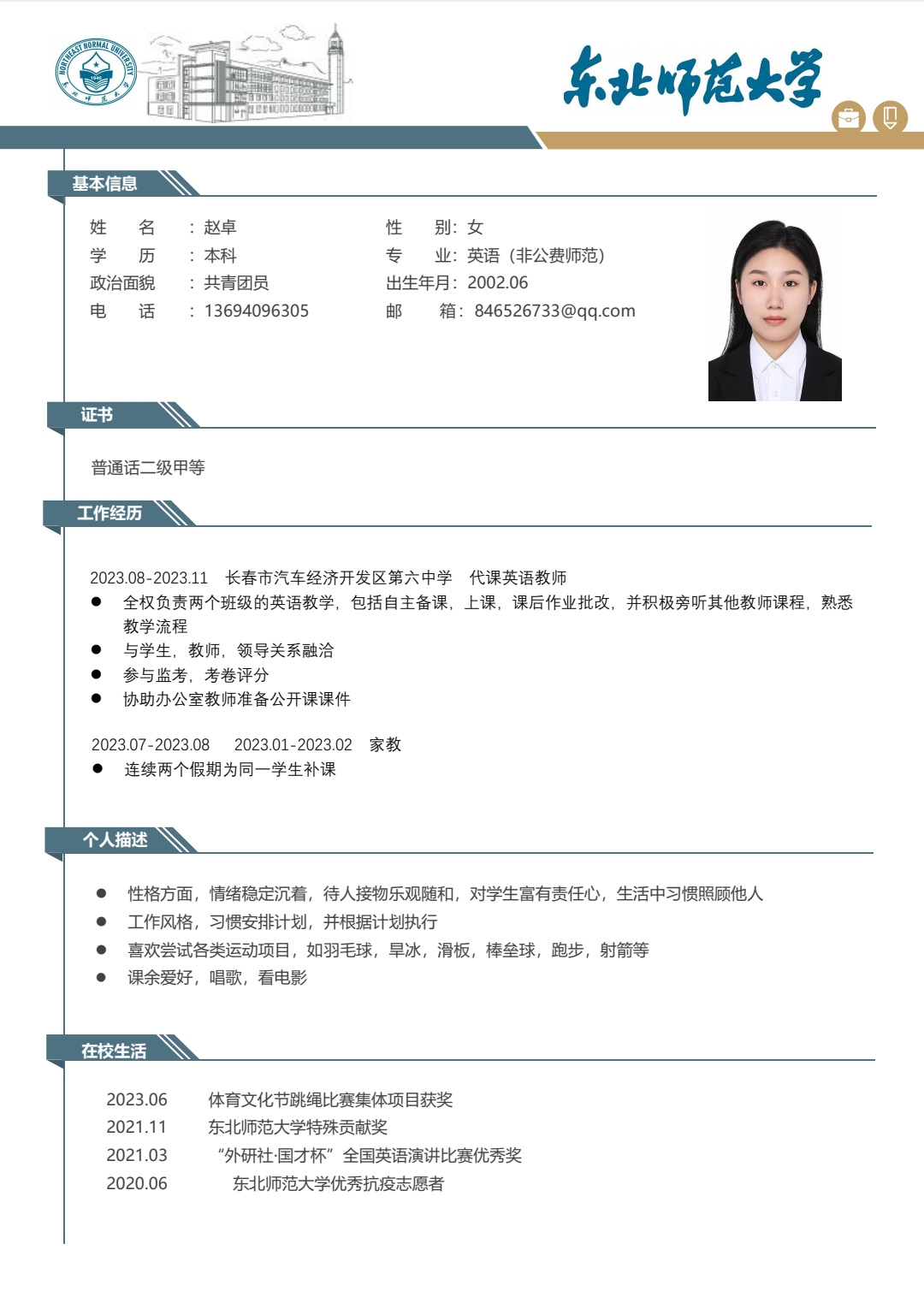 期望职位:初中地理教师,高中地理教师|期望地区:长春市