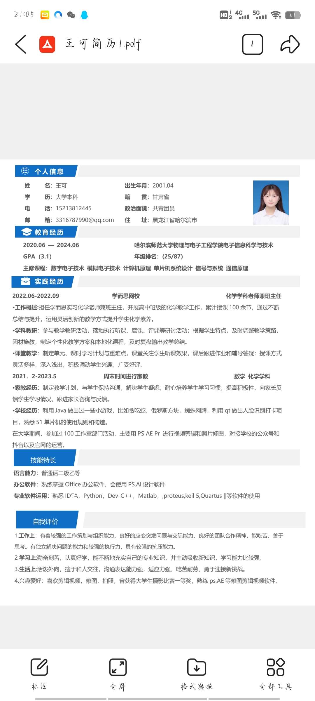 期望职位:高中化学教师,小学科学教师,班主任|期望地区:哈尔滨市,深圳市,南京市