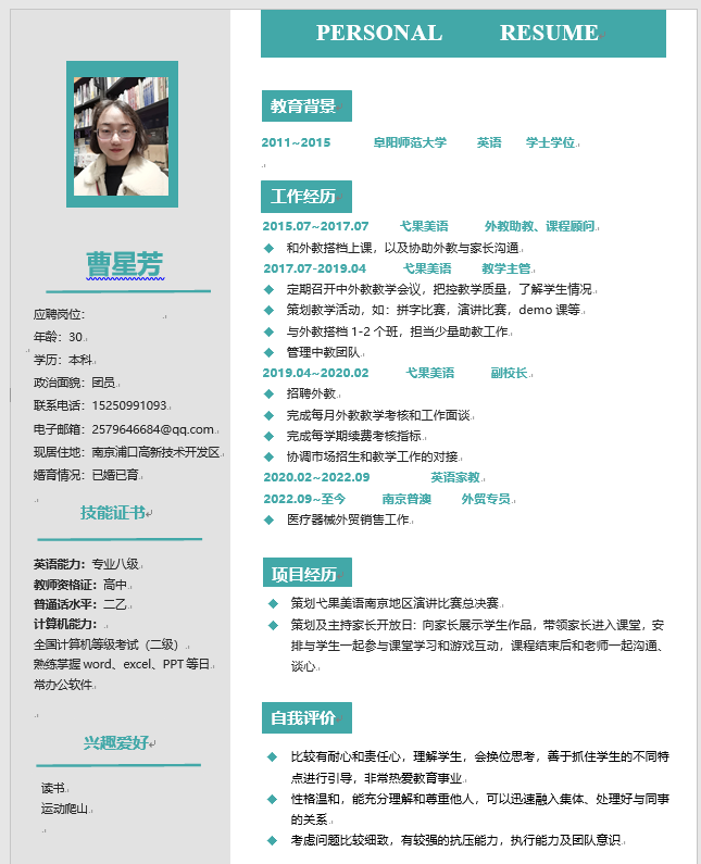 期望职位:职业教育/培训教师,小学英语教师,初中英语教师,讲师|期望地区:南京市