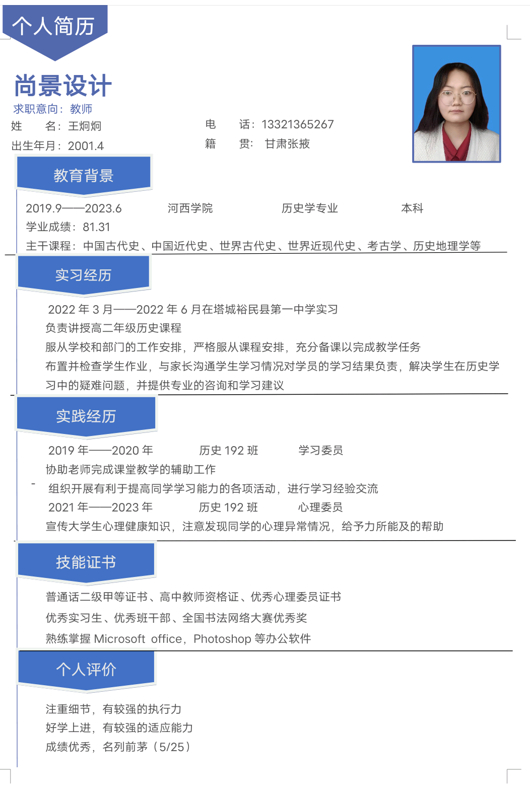 期望职位:初中历史教师,高中历史教师|期望地区:宿迁市