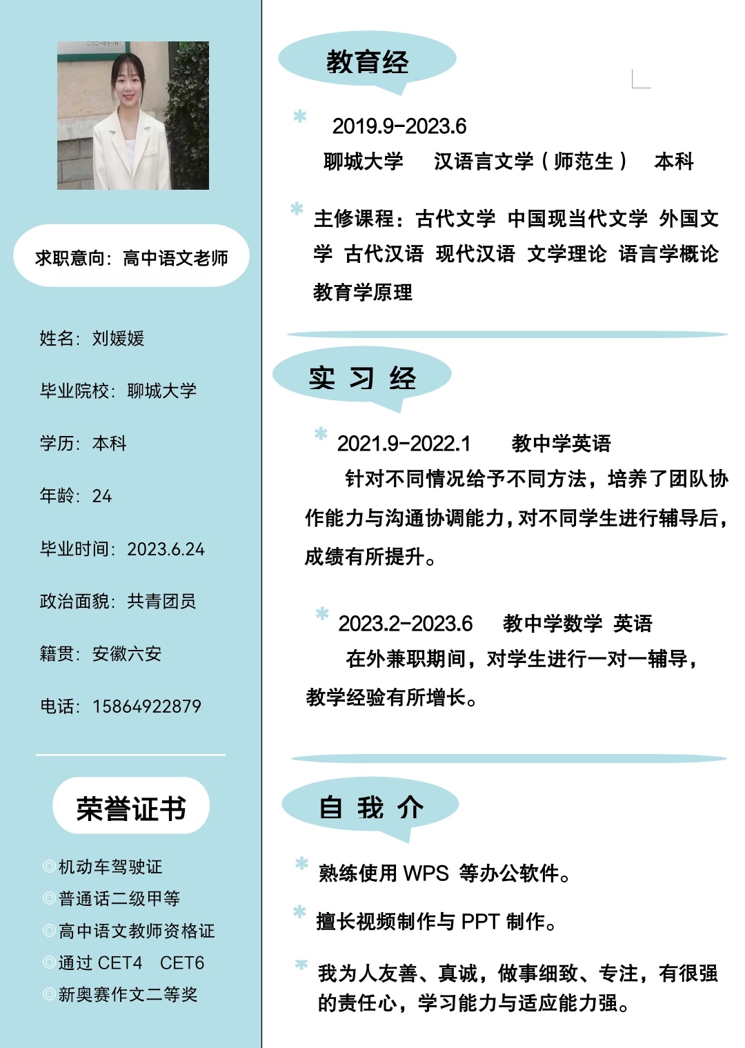 期望职位:初中语文教师,高中语文教师,语文教师,中学各科教师招聘,图书管理|期望地区:合肥市,六安市,南京市