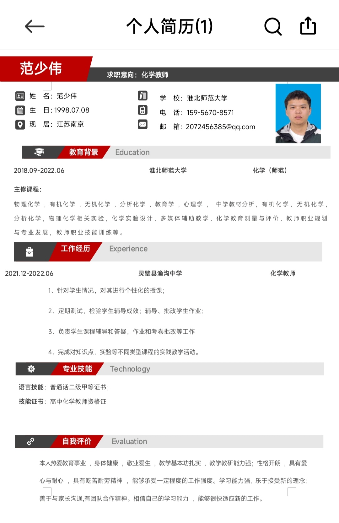 期望职位:初中化学教师,高中化学教师|期望地区:淮北市,南京市