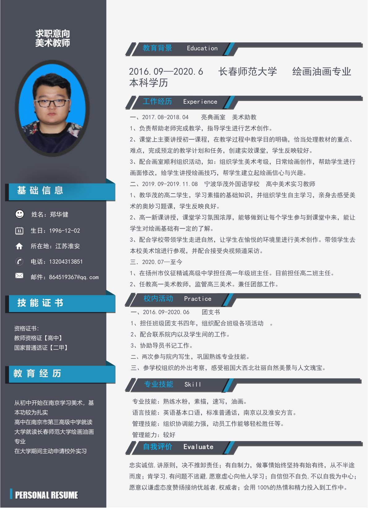 期望职位:美术教师,美术教师,美术助理,高中班主任兼助教,高中美术教师|期望地区:淮安市