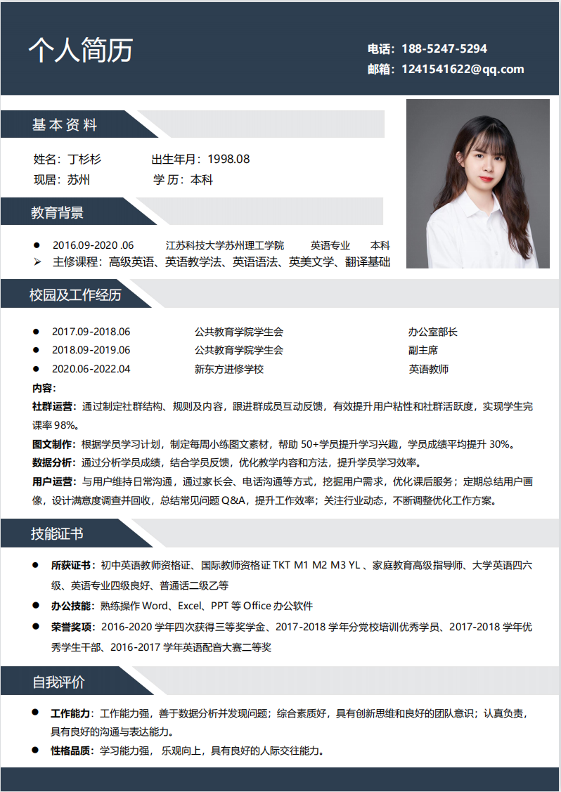 期望职位:小学英语教师|期望地区:苏州市