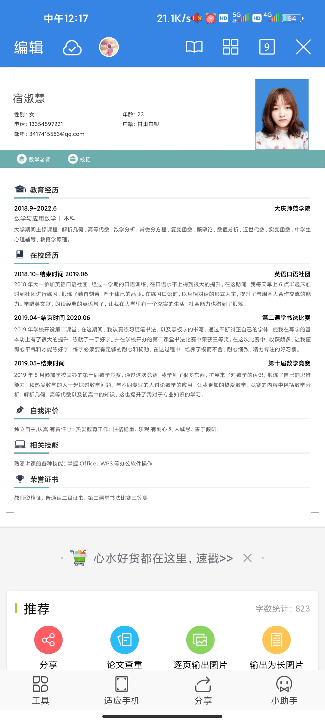 期望职位:初中英语教师,小学英语教师,校报编辑,档案管理员|期望地区:西安市,兰州市