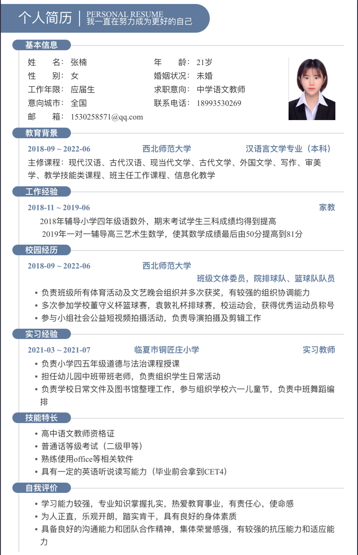 期望职位:小学语文教师|期望地区:诸暨市,宿迁市,盐城市
