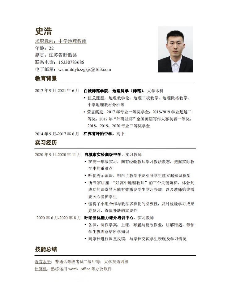 期望职位:初中地理教师,高中地理教师|期望地区:淮安市