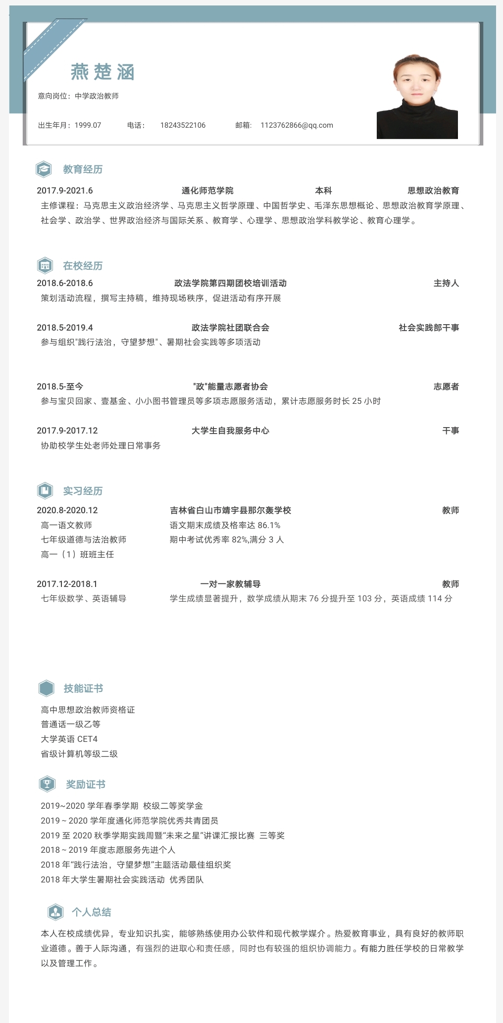 期望职位:初中政治教师|期望地区:南京市,苏州市,无锡市