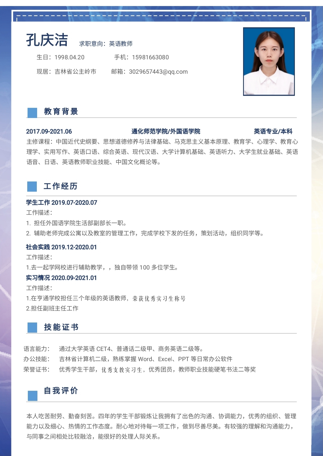 期望职位:初中英语教师|期望地区:沈阳市,大连市,淮安市