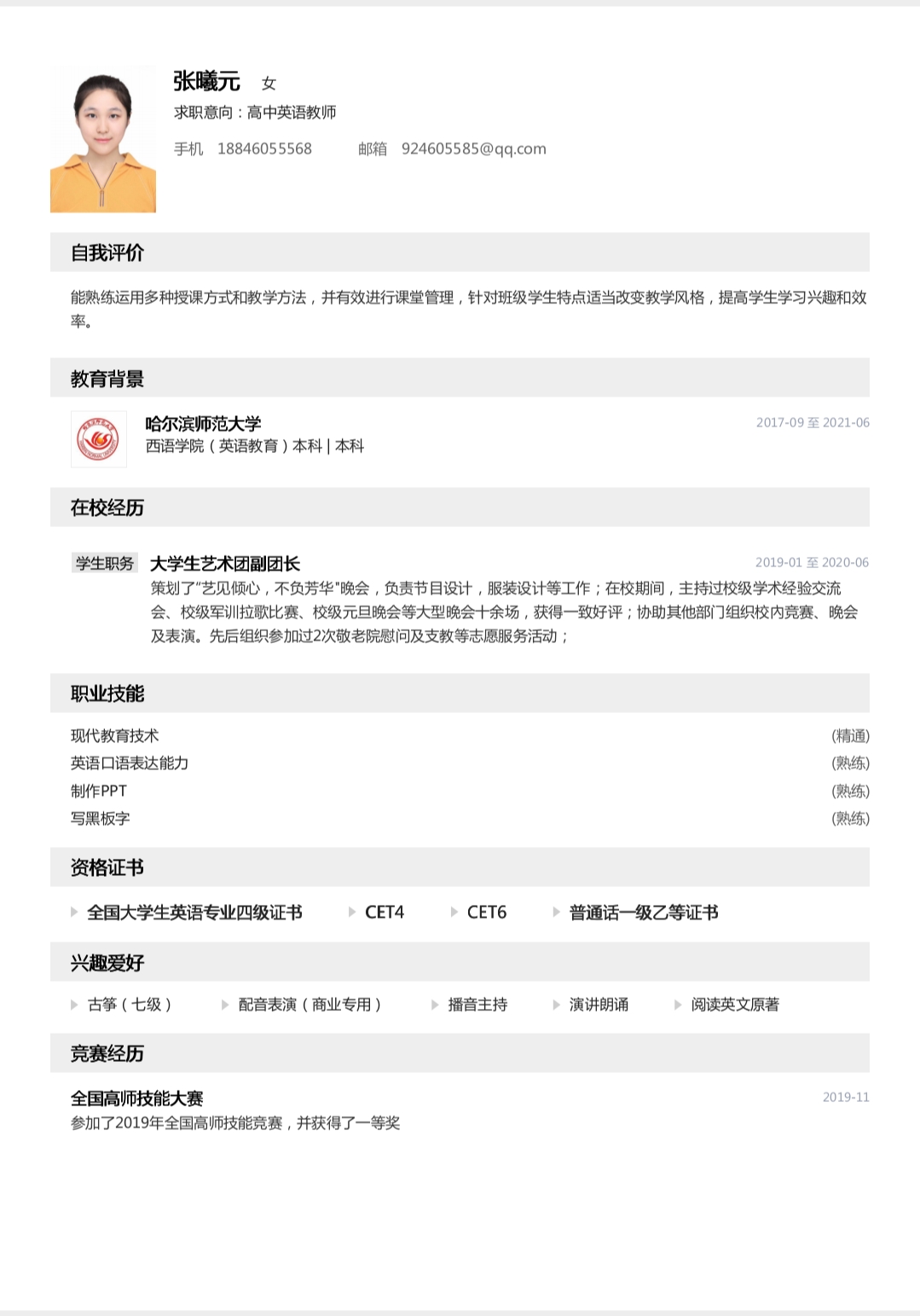 期望职位:高中英语教师|期望地区:杭州市,南京市,黄浦区