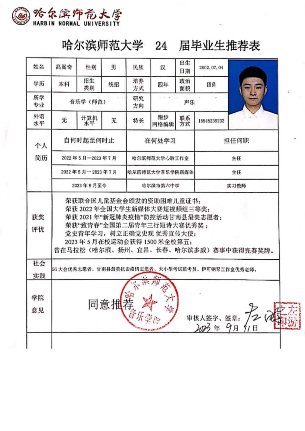 本人是音乐教育专业学生,有丰富的教育知识体系与教师专业技能做基础,从小型的学生组织的排练到省重点学校的艺术节排练都能游刃有余,善于分析和吸取经验;熟悉网络推广,尤其是对社会化媒体方面有独到的见解和经验,熟练操作办公软件;个性开朗,容易相处,团队荣誉感强,热爱运动;人生追求是尽力帮助我所教的学生们有美好、有力、有利的教育。