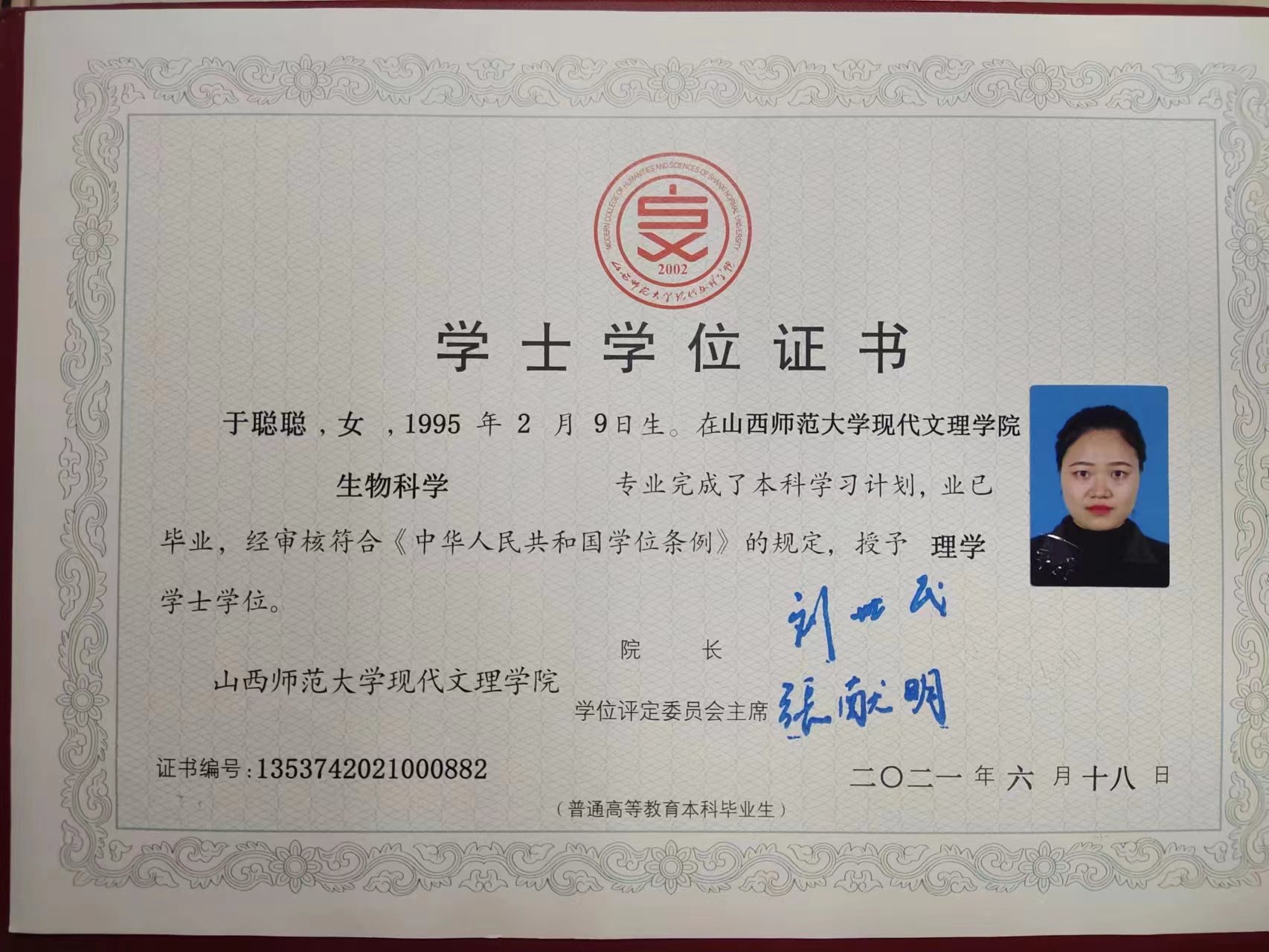 性格活泼乐观、适应能力强,勤奋好学.在校期间认真完成学业,刻苦钻研,主持一项省级科研创新项目,获得2022-2023学年研究生国家奖学金,已取得高中生物教师资格证,并积极参与实习工作,努力提升专业技能,为日后顺利参与工作打下基础.为人处事方面,与同学、老师和睦相处,拥有良好的人际关系.