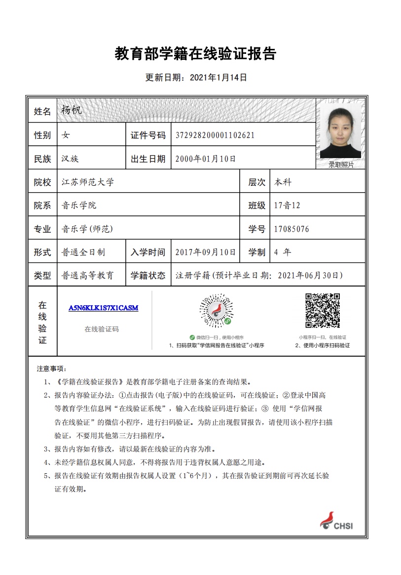 我在大学期间积极参加各类文艺演出活动,也是音乐学院合唱团中的一员,合唱团曾获得江苏省紫金合唱节铜奖;在大学期间我担任班级副团支书以及院团委办公室主任,曾获得优秀共青团干部、优秀学生干部、三等奖学金,大学期间,我考取了高中音乐教师资格证以及普通话二级甲等的证书以及全国计算机一等级证书。