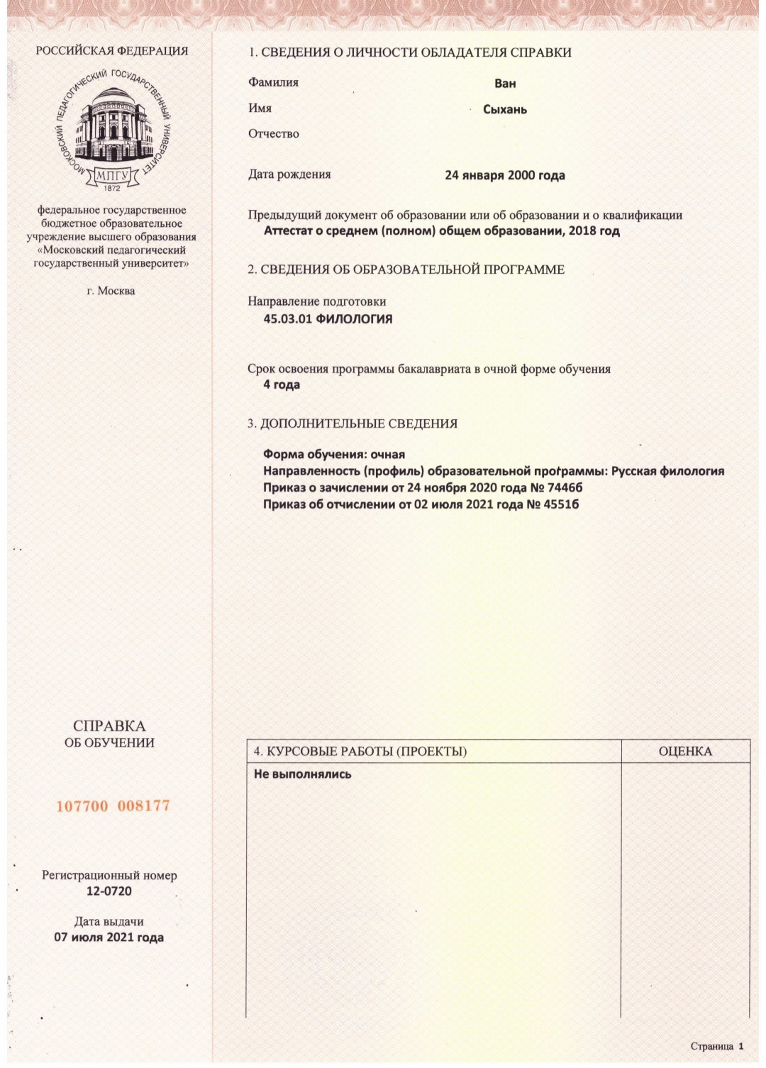 2020年在莫斯科国立师范大学交换学习一年,英语四六级,普通话二甲,俄语专四优秀证书